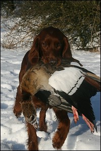 wilden Gänsen. Täglich sind die Kleinen mit mir bis zu 3 Stunden im Revier und sind schon mit fast allem vertraut Schon von Welpenalter an und seit ich mit ihnen raus ins Revier gehe sind Brombeerhecken kein Hindernis. An jegliche Art von Wild wid prompt drangegangen. Ob Kanin, Ente, Taube, Fasan, Fuchs oder Reh. Alles ist toll und wird bearbeitet, rumgezupft, getragen (was möglich ist zu tragen). Bei den Verbliebenen wurde mit dem Apportieren angefangen. Mit Geduld, dem Alter entsprechend, muss ich wirklich sagen (und ich hab aufgrund meiner Hundeausbildertätigkeit wirklich Ahnung) sind die Kleinen äußerst pfiffig und lernen ungewöhnlich schnell. Es macht wirklich sehr viel Spaß mit den Kleinen zu arbeiten – sie machen es einem leicht. |