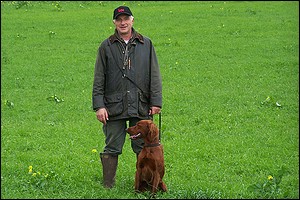 Richterbericht: Die junge lrish-Setter-Hündin wirkt zu Beginn der Suche verspielt und zeigt sich oft mit tiefer Nasenführung. Sie arbeitet kurz eine Hasenspur, kommt aber auf Pfiff recht schnell zurück. Mit gutem Wind überläuft sie einen Fasan, ohne vorzustehen. Im zweiten Gang verbessert sich ihre Suche immer weiter und auch die Arbeitsfreude wird geweckt. Gehorsam und Führigkeit waren durchweg sehr gut. Die Hündin gelangt nochmals in den Witterungsstrom eines im Altgras sitzenden Fasans. Amelie rückt auf und steht kurz mit wenig Spannung vor. Während des Paargangs mit Agomo wird sie immer sicherer und zieht sehr gute Schleifen. Der Führer pfeift nun auch nicht mehr so viel. Sekundieren konnte nicht geprüft werden. Die Hündin ist schussfest. |